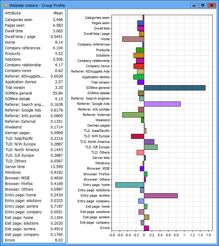 The self-organizing map was created from the final data set with Viscovery SOMine, using standard settings, "Accurate" training schedule, and reduced "Priorities" between 0.3 and 0.6 for OS and browser specific attributes.
