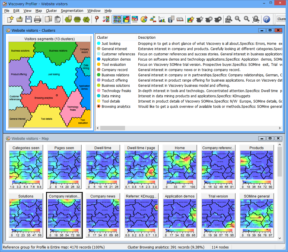 The demo is based on click data from visits to the Viscovery website over six months. In the map below, you can see the behavior classes that were identified and how they were interpreted. By clicking any region of the map, you can open the corresponding profile and inspect class characteristics.