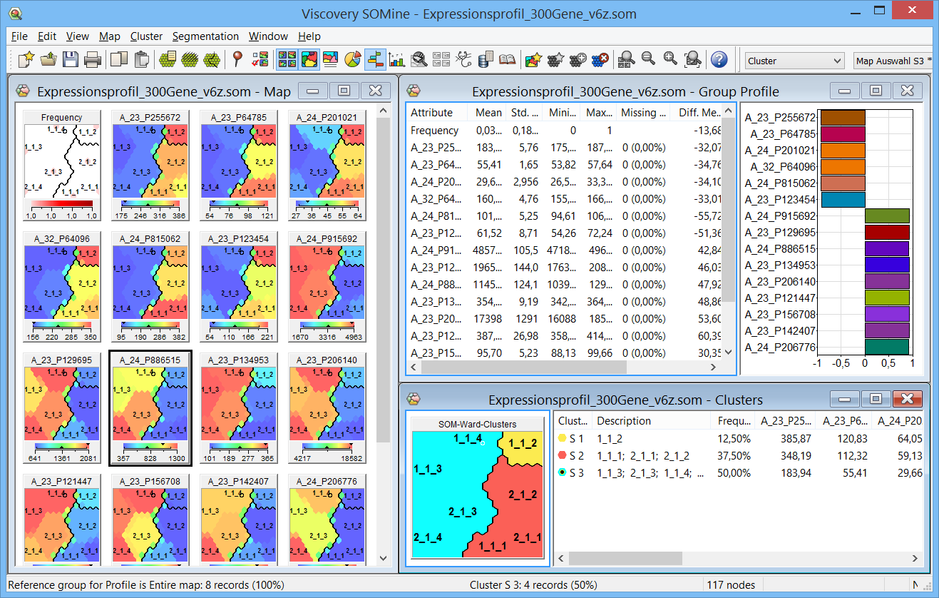 This Viscovery application shows the clustering of gene expression data of cancer patients, exhibiting concurrences of activated genes for biomarker discovery.